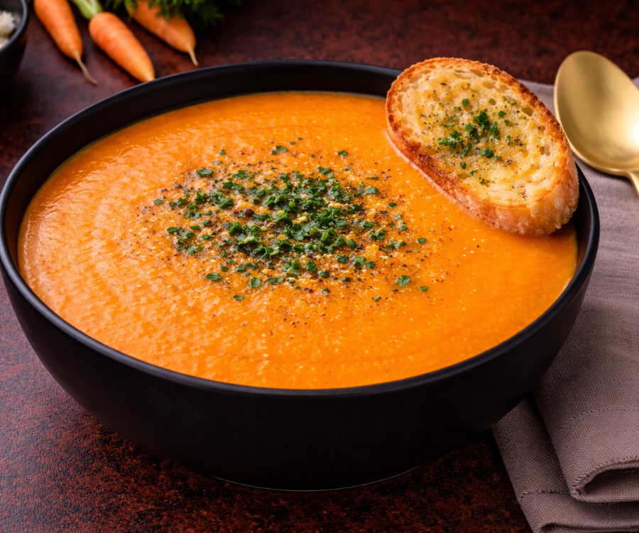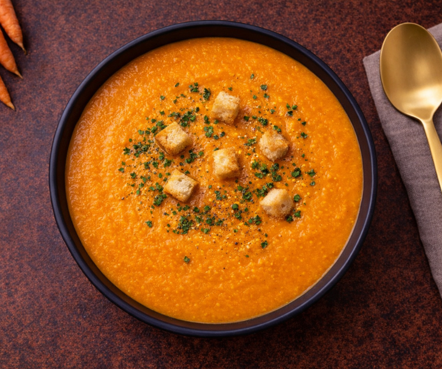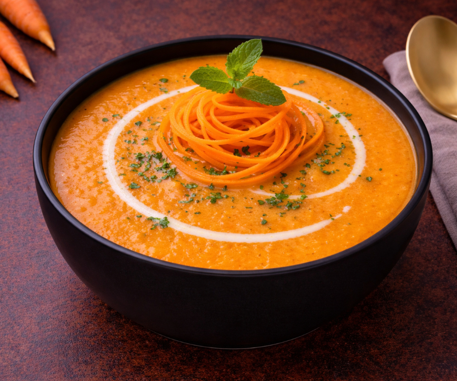 Color vibrante amarillo/naranja, textura aterciopelada y un sabor ligeramente dulce. Preparada con zanahorias frescas, sazonada con especias suaves y un toque de crema para lograr un platillo reconfortante, ideal como entrada o guarnición.
